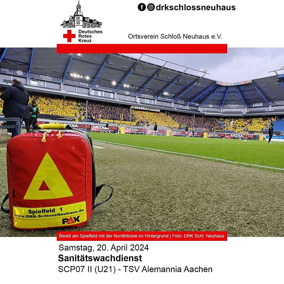 Am Samstag, 20. April 2024, führten wir bei dem Regionalliga-Fußballspiel SC Paderborn 07 II (U21) gegen TSV Alemannia Aachen in der Home Deluxe Arena den Sanitätswachdienst durch.