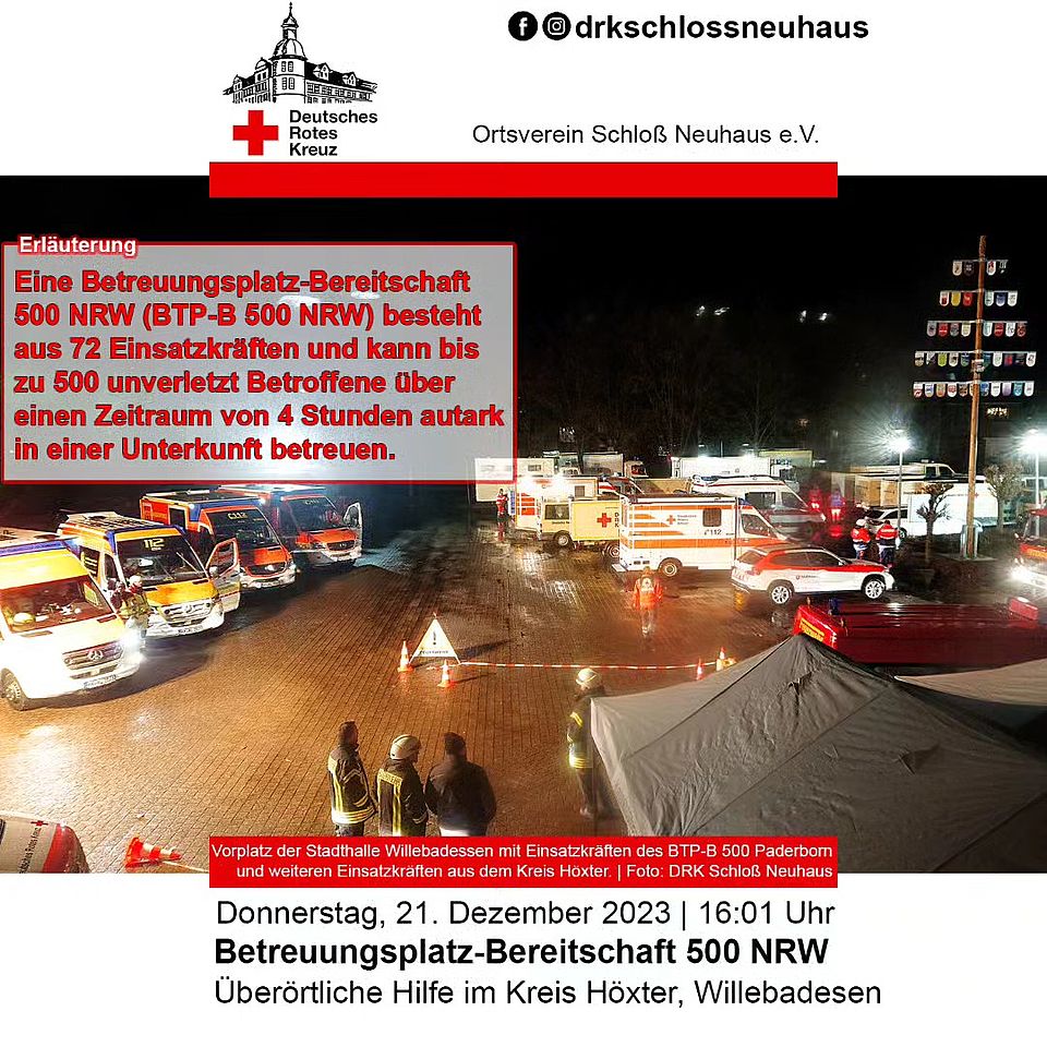 Am Donnerstag, den 21.12.2023 wurde um 16:01 Uhr die Betreuungsplatz-Bereitschaft 500 des Kreises Paderborn zu einem Zugunfall in Willebadessen alarmiert. Hier galt es ca. 200 unverletzt betroffene Personen in der örtlichen Stadthalle zu betreuen.