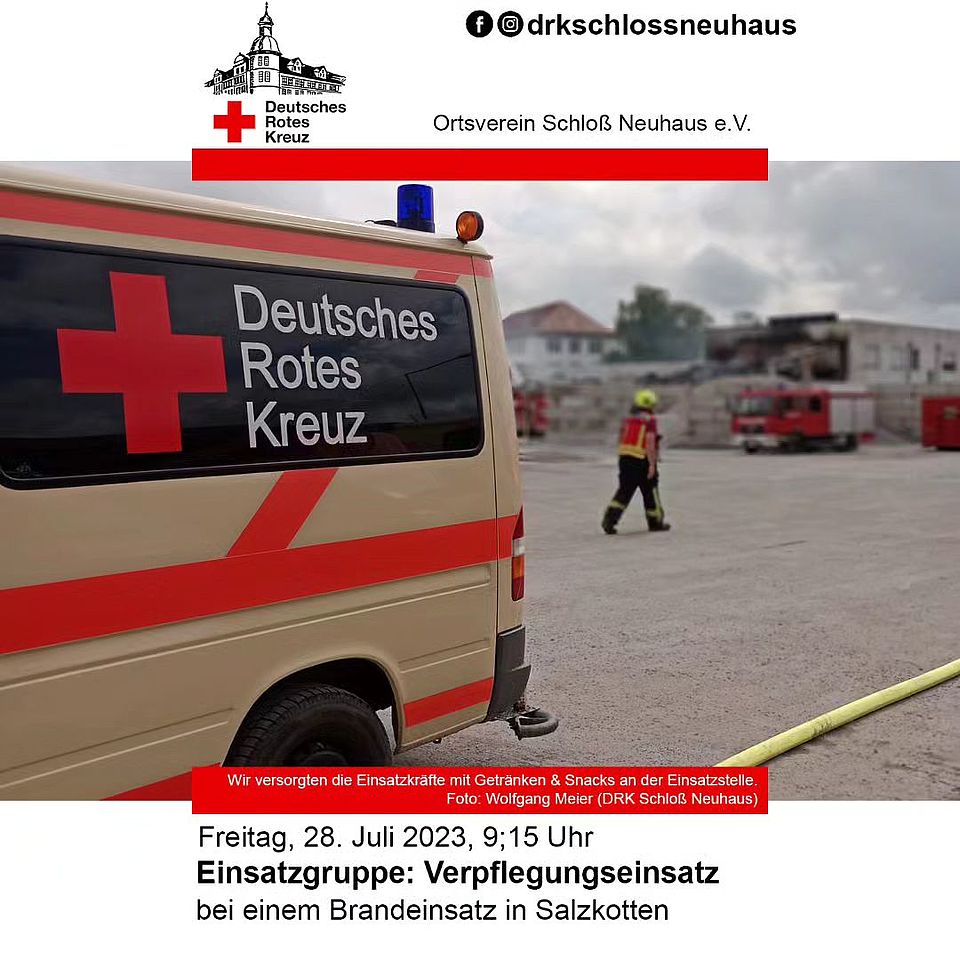 Am heutigen Freitag wurde die DRK-Einsatzgruppe Schloß Neuhaus mit der Verpflegungseinheit um 9:15 Uhr zur Unterstützung der Feuerwehr nach Salzkotten alarmiert. Dort kam es zu einem größeren Industriebrand, welcher eine längere Einsatzdauer erwarten ließ.